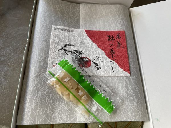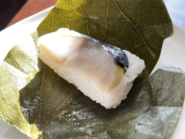 出来立ても美味しいですが、すこし時間がたってからでも美味しいのが柿の葉ずし。酢めしが馴染んで良い感じになります。冷蔵庫に入れるとご飯が硬くなるので常温で大丈夫だそうです。
