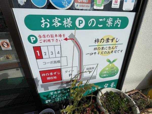 萬葉 柿の葉ずし 瑞鳳店 宮城県仙台市青葉区霊屋下16-2 電話:022-213-1318(予約可) 営業時間:10:00~17:00 定休日:木曜日 支払い:カード不可/電子マネー可/QRコード決済可 駐車場:有1台