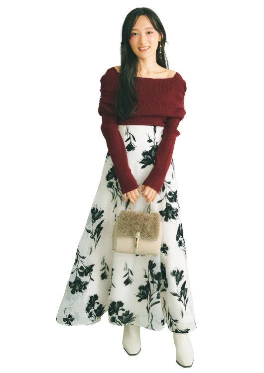 ニット¥9,790/Swingle(Swingle 有楽町マルイ店) スカート¥17,600/MERCURYDUO(MERCURYDUO ルミネエスト新宿店) イヤリング、リング各¥11,000/ステラハリウッド バッグ¥14,300/ノエラ ブーツ[ファー付き]¥17,930/RANDA