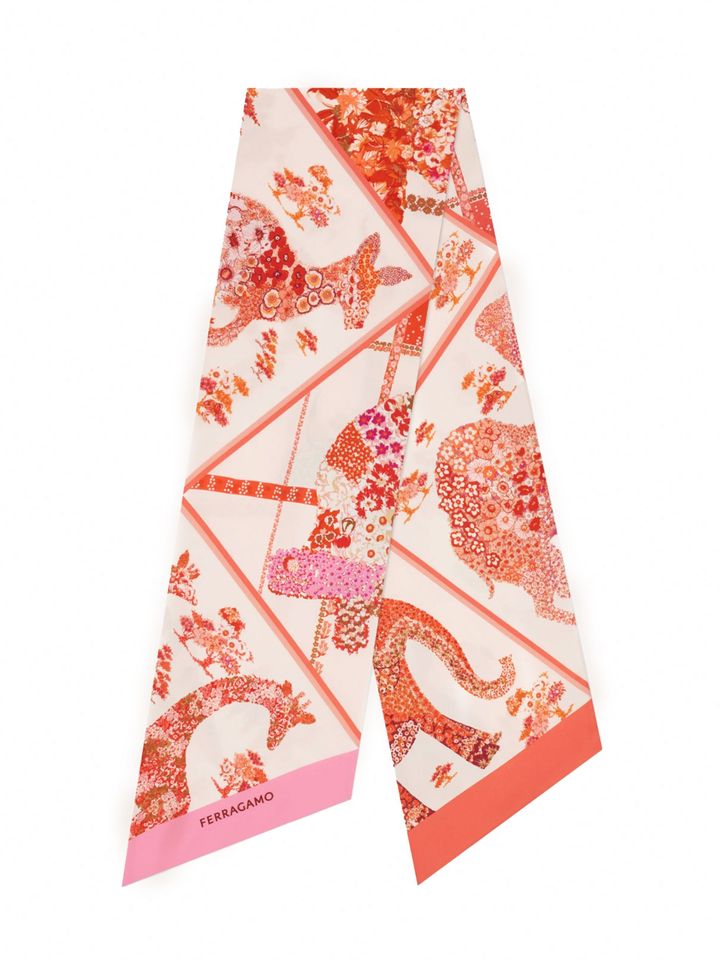 そこで頼りになるのが、軽やかに持ち運べてシワの心配もしなくてよいスカーフだ。さらりと羽織ればカーディガン代わりとして温度調整ができるのはもちろん、スタイリングにさりげないアクセントを添えてくれる。首もとに巻いたり、ヘアに取り入れたり、バッグに結んでアクセサリー感覚で遊べば、装いの幅は驚くほど広がる。