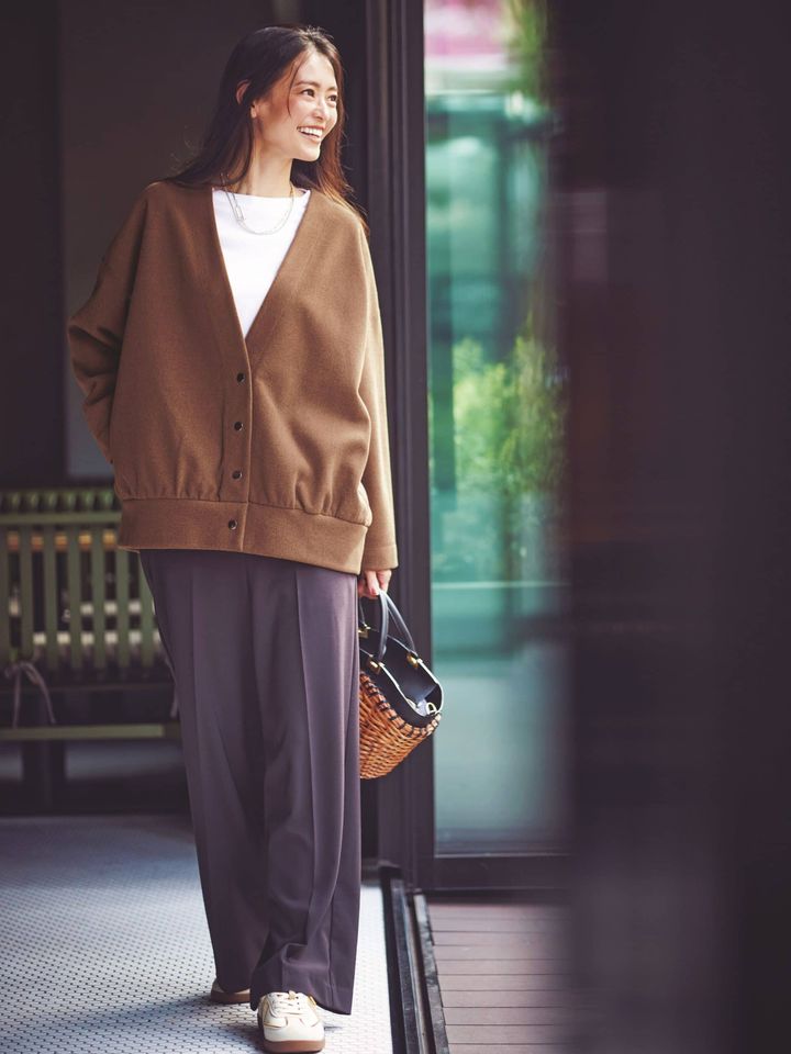 カーディガン¥14,960(Day by Day It’s international)パンツ¥9,990(アンフィーロ)バッグ¥30,800(ヴィオラドーロ)スニーカー¥15,950(アスファルト/EARTH MARKETING CORPORATION)ネックレス¥46,200(アナプノエ/フォーティーン ショールーム)カットソー(スタイリスト私物)