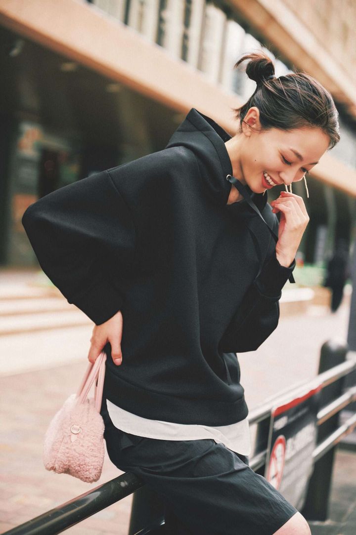 パーカ¥9,680(エルド)パンツ¥16,500(シークレット・トロフィー)バッグ¥14,300ピアス¥9,900(ともにツル バイ マリコ オイカワ)