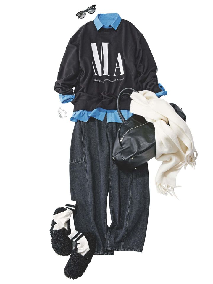 カジュアル定番のロゴスウェットもブラックをチョイスすれば、シックなスタイルにシフト。ブルーのシャツをインしてよりスマートさを際立たせます。メンズライクなトップスは、丸みを備えたカーヴィーパンツをあわせて女性らしさをアピール。
