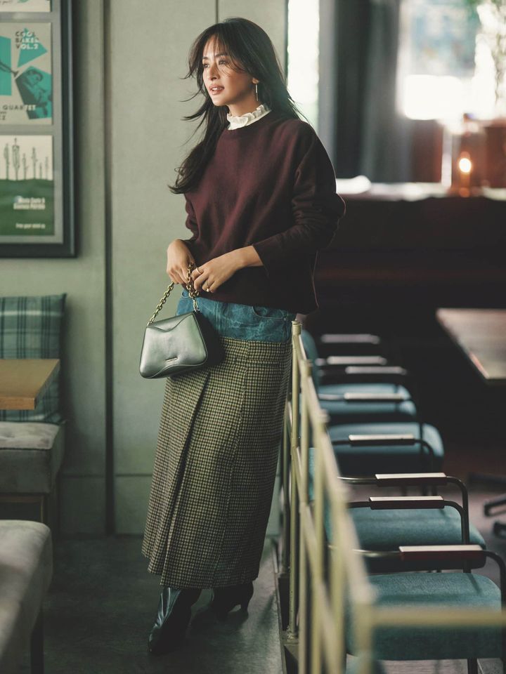 スウェット¥42,900(エイトン/エイトン青山)ブラウス¥26,400(マルティニーク/マルティニーク ルミネ横浜)スカート¥25,300(メゾンスペシャル/メゾンスペシャル 青山店)バッグ¥13,900(CHARLES & KEITH)ブーツ¥71,500(PIPPICHIC/ベイジュ)ピアス¥55,000〈faveur.jewelry〉リング[人さし指]¥3,740〈KRONOS〉(ともにロードス)リング[薬指]¥187,000(カラットアー/イセタンサローネ東京)