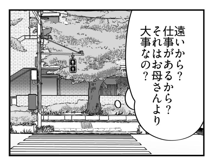 チエさんにもアツシさんにもそれぞれの生活があります。どうしても仕事の調整がつかないことだってあるのかもしれません。けれど今優先すべきは「仕事」よりも「お母さん」だと、チエさんは思っています。悔しくて涙するチエさん。わずかの面会でさっさと帰ってしまったアツシさんに、はたしてこの思いは届くのでしょうか……?