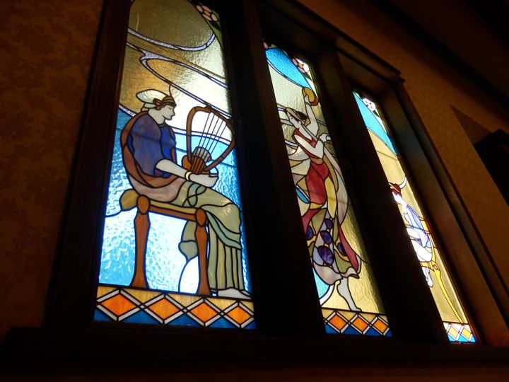 外から見ると円形にせり出しているのが、大広間。この大広間の西側にステンドグラス「初夏」が飾られている。これはデザイナーであり、福沢桃介の義弟にあたる杉浦非水の原画をもとに制作されたもの。昭和初期の改築の際に、ステンドグラスの一部分が紛失し、長らくレプリカが使われていたが、近年になって名古屋市内でオリジナルが発見され、2017年3月末に創建当時のものへと入れ替わった。