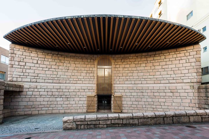 石造りの外観がアイコニックな「松濤美術館」は白井晟一による設計。外壁に使用されている石は、韓国ソウル郊外の石切場で採れるピンク色の花崗岩だ。当時の日本では名前もないほど知られていない種類だったため、白井本人が“紅雲石”と命名して日本へ運んだという経緯がある。