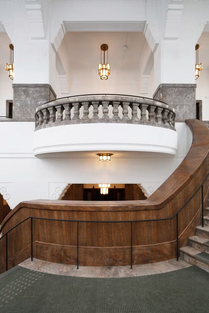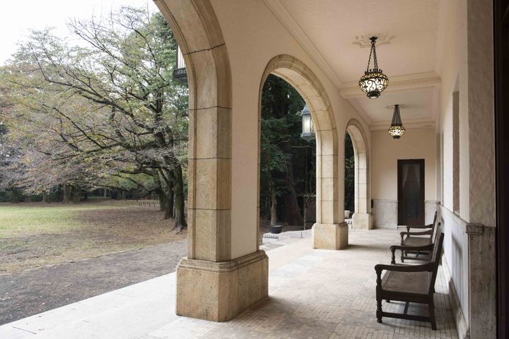 シンプルな意匠ながら、まるでヨーロッパのような雰囲気のベランダ。美しい照明と天井のデザインにも注目してほしい。館内の暖炉やシャンデリアなどは建設当初から使われているものも多く、当時の息遣いを感じられる都心の隠れた名建築だ。
