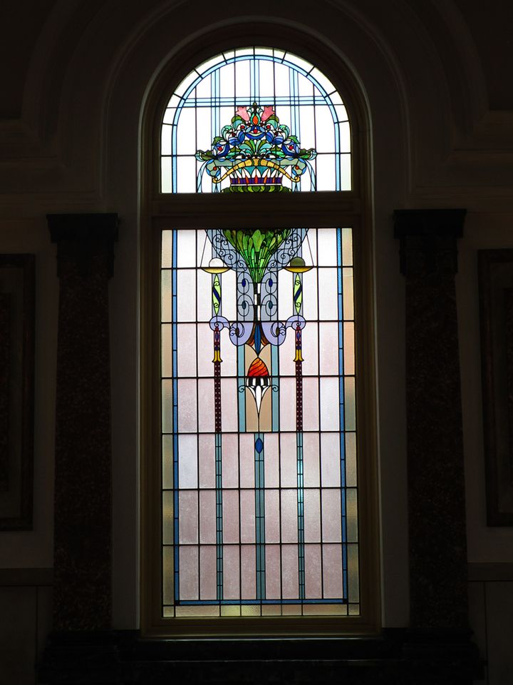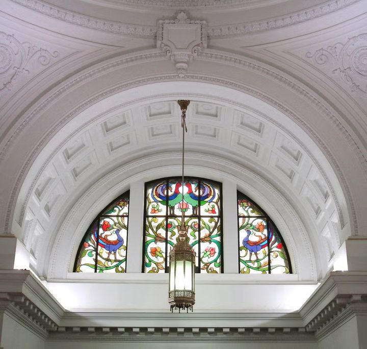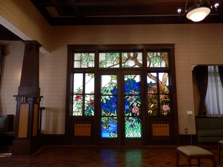 館内をさまざまに彩るのは、鮮やかなステンドクラス。ドーム式の中央ホールや階段室などに鳳凰や植物をモチーフにしたステンドクラスは、鳩山会館のステンドグラスを手掛けた作家と同じく小川三知のアトリエで製作されたもの。さらにこのステンドクラスには、建築家の伊藤忠太も携わっている貴重な作品だ。