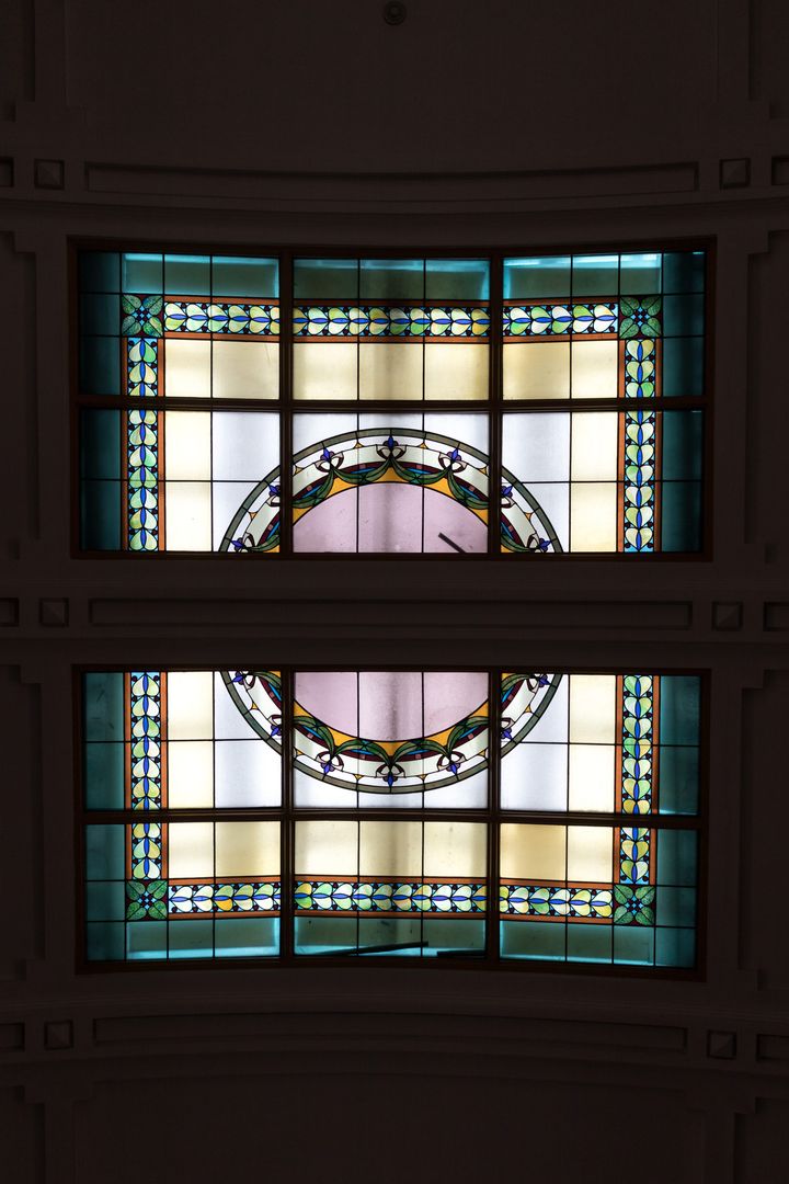 さらに吹き抜けとなっている、階段室の天井を見上げると「公明正大」を表す日輪が描かれている。ステンドグラスからも、この建物がかつては裁判所であったことが見て取れる。