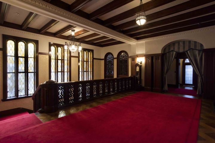 2階の階段広間は赤い絨毯やステンドグラス、透かし窓がロマンティックな雰囲気。透かし窓には仏教的なモチーフが使われており、西洋の建築様式と日本文化が融合した空間が体験できる。