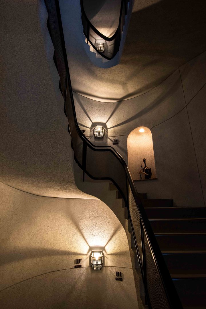 照明とカーブが美しい、らせん階段。照明も建築家の白井晟一がデザインしたもので、曲線を描くらせん階段と照明から伸びる影が独特の空間を生み出している。ゆっくりと味わいながらのぼりたい。