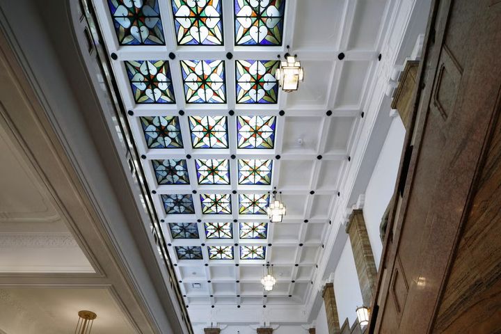 リニューアル前に正面玄関として使われていた、西広間から2階へと階段をあがると天井には色彩豊かな美しいアール・デコ調のステンドグラスが飾られている。日本伝統の“格天井”にステンドグラスをはめ込むという和洋折衷の意匠が魅力的だ。