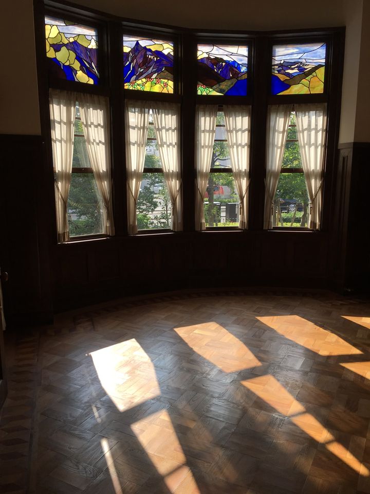 旧食堂には、山々の風景が描かれたステンドクラスが飾られている。ステンドクラスは光を受けて、より一層輝きを放つ。