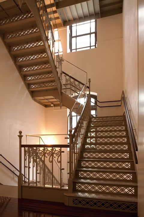 格子状の鉄骨階段は、デザインの美しさだけでなく実用性も兼ね備えている。当時(明治時代)はガス灯の照明が使用されていたため、ガスの供給がない昼間は暗くなってしまう。しかし、格子状のデザインにすると外光が入るため明るくなり、安全面で有効であった。このような現代にも通用するデザインが建物内に数多く残されている。