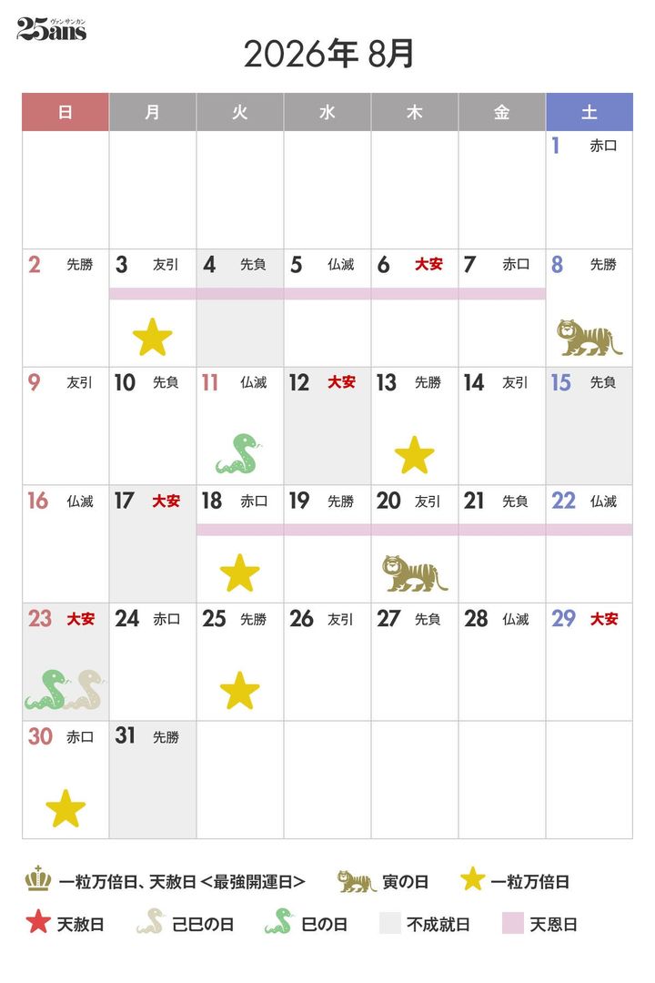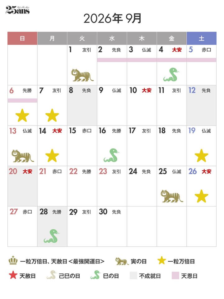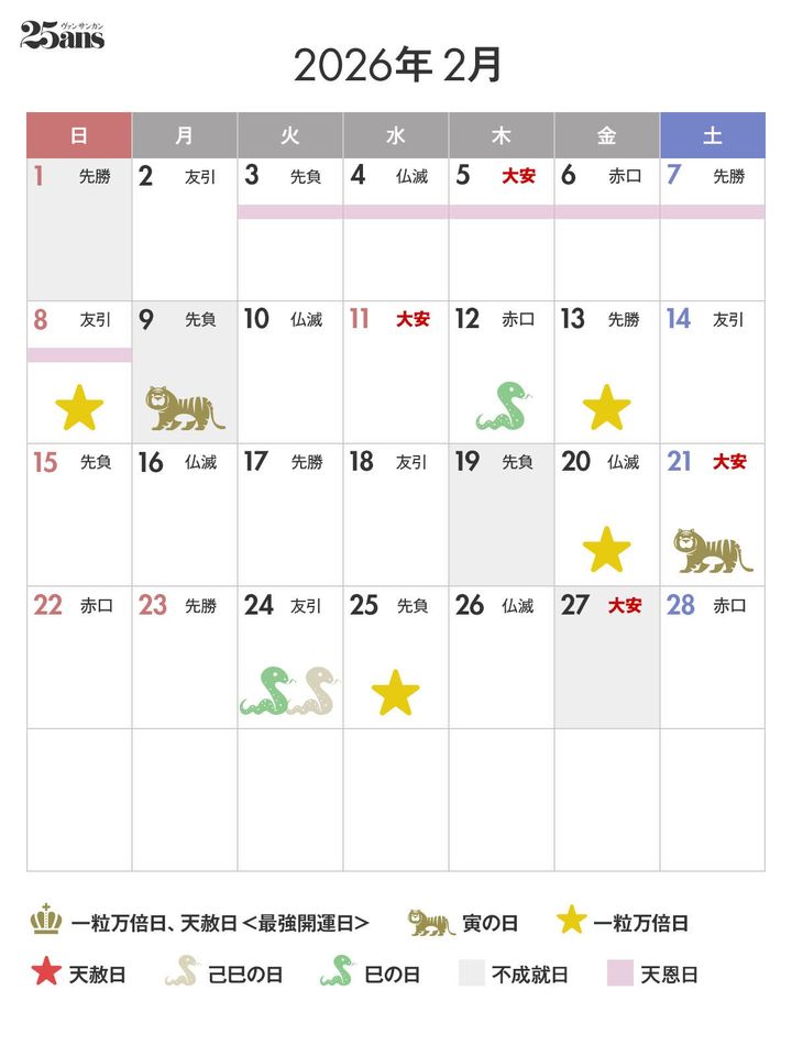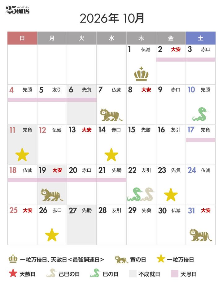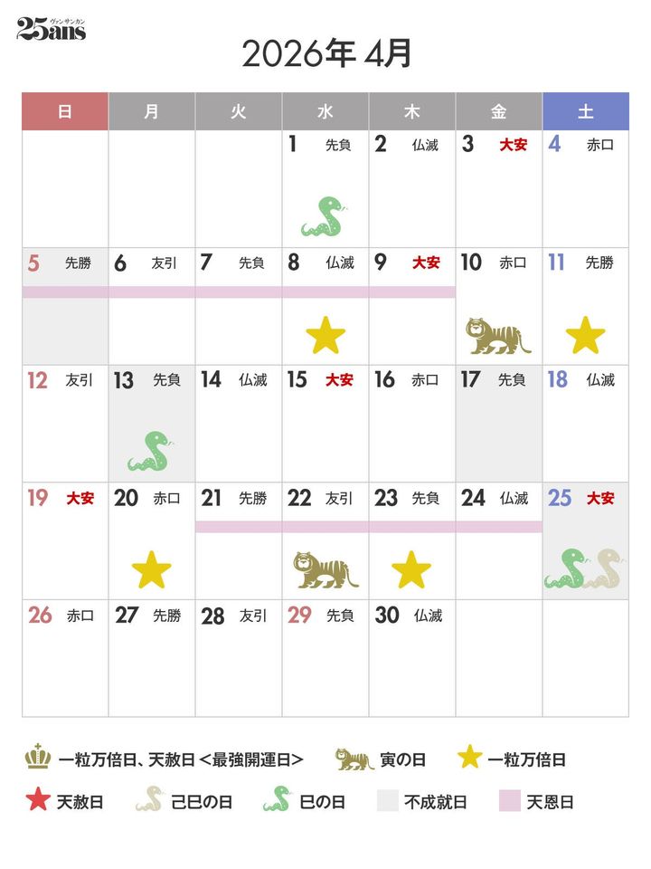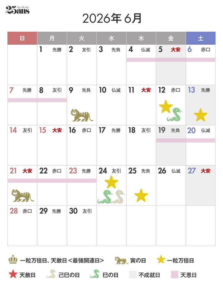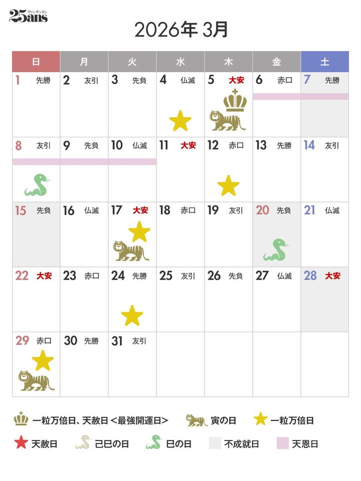 最上の吉日である天赦日に、大安一粒万倍日寅の日がすべて重なる、2026年屈指の最強開運日! お財布の新調、宝くじの購入、大きな契約や決断など、あらゆる勝負事におすすめです。