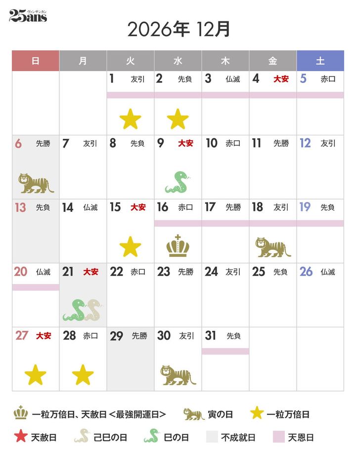 が重なる開運日。年末年始の準備や、結婚・入籍、大きな買い物など、公私ともに非常に縁起の良い日。