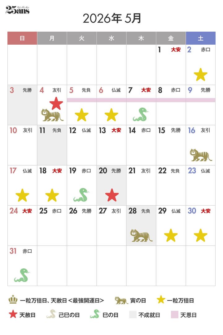 2026年には3月5日、5月4日、5月20日(不成就日)、7月19日(不成就日)、10月1日、12月16日に訪れます。
