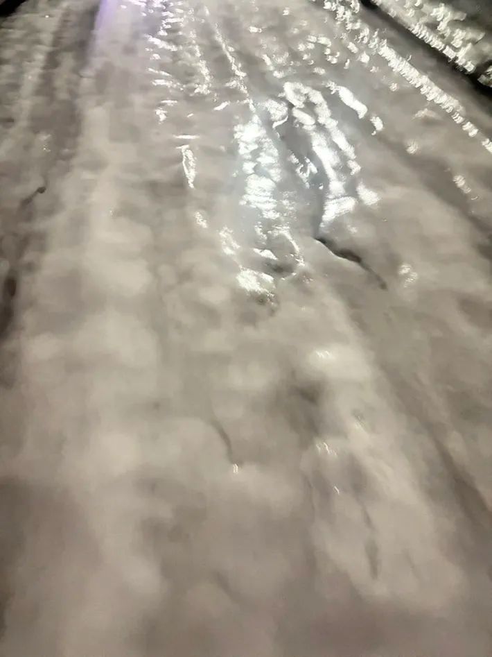 まさに天然のアイススケートリンクと化してしまった、道路。