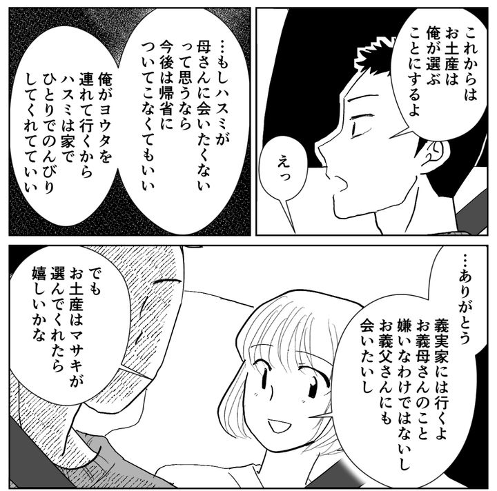 夫は「ハスミが毎回どんな気持ちだったかようやくわかった」と謝罪、今後は自分がお土産を選ぶと言ってくれました。