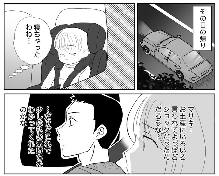 夫が選んだお土産が義母にけなされ、帰りの車内は重い沈黙に包まれました。