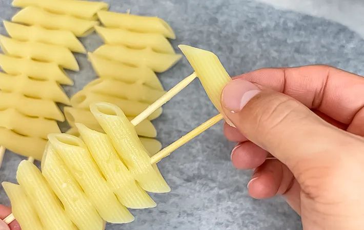 粗熱が取れたマカロニを、竹串にすき間なく刺してください。