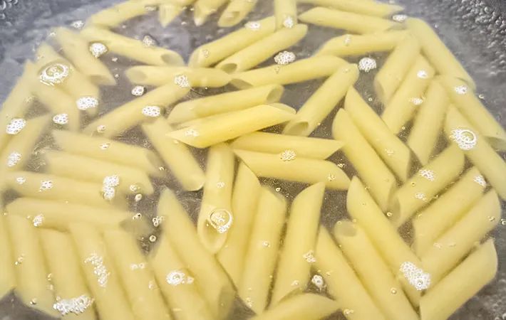 マカロニを袋の表示時間より1分ほど短めにゆでてから、ザルにあげて水気を切ってください。