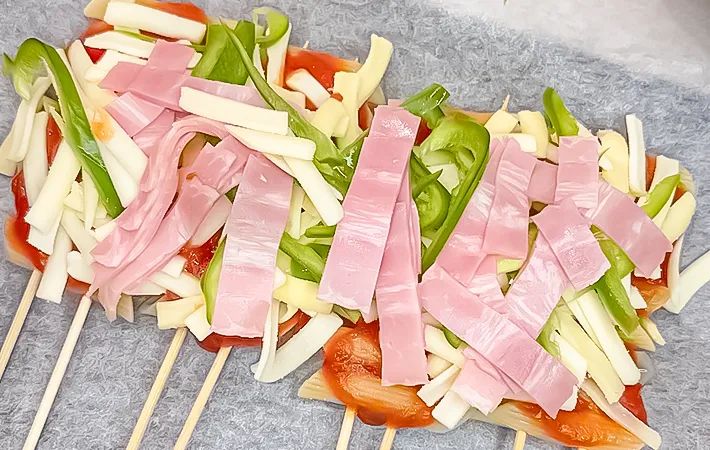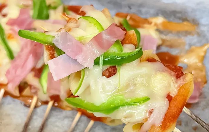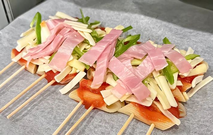 『マカロニピザスティック』は、ゆでたマカロニを串に刺し、ピザソースとチーズ、具材をのせてこんがり焼くだけのレシピ。