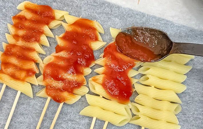 オーブン用の天板にクッキングシートを敷き、マカロニを刺した串を並べたら、表面にピザソースを薄めに塗りましょう。