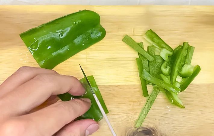 ベーコンは1cm幅の短冊切りにし、ピーマンはヘタと種を取り、細めの半月切りにしておきましょう。