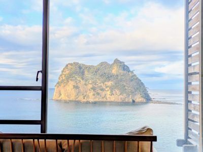 どういうことかと思ったら、なんと崖に沿って、海へ向かって階が下がっていくんです。そのおかげで、部屋は超オーシャンフロント!私が宿泊した2階からだと、上から見下ろすでもなく、ほぼ真正面に堂ヶ島を眺めることができます。