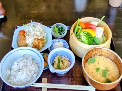 季節の蒸し野菜と宮崎名物のチキン南蛮がセットになったお得なランチ『あや定食 1200円(2025年12月現在)』。2025年いちばんリピートしました!