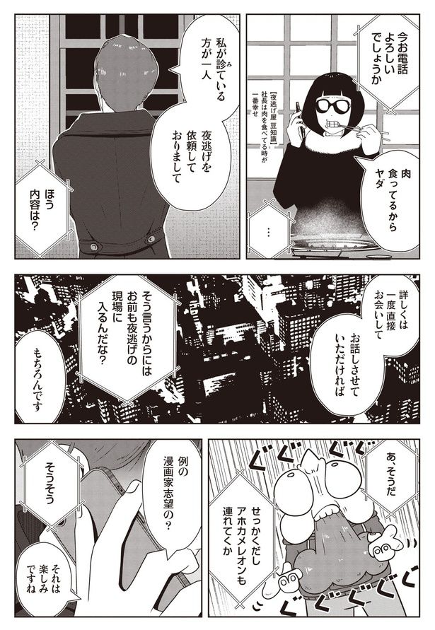 「夜逃げ屋」とは、DVをするパートナーや毒親などから逃げたい人々の引っ越しを手伝う特殊な業者。漫画家を目指していた作者・宮野シンイチはある日、TVで見かけた夜逃げ屋という仕事と、そこを取り仕切る女社長の漫画を描きたいと思い取材を申し込む。取材当日、夜逃げの現場を手伝うことになった宮野は、壮絶な現場を目の当たりにした後、社長の鶴の一声で夜逃げ屋に就職することにーー。外からは普通に見える家庭でも、一歩踏み入れると見えてくる衝撃的な現実。実際に夜逃げ屋で働く作者が、その現場をリアルに描くコミックエッセイ『夜逃げ屋日記』を、ご好評につき再連載いたします。