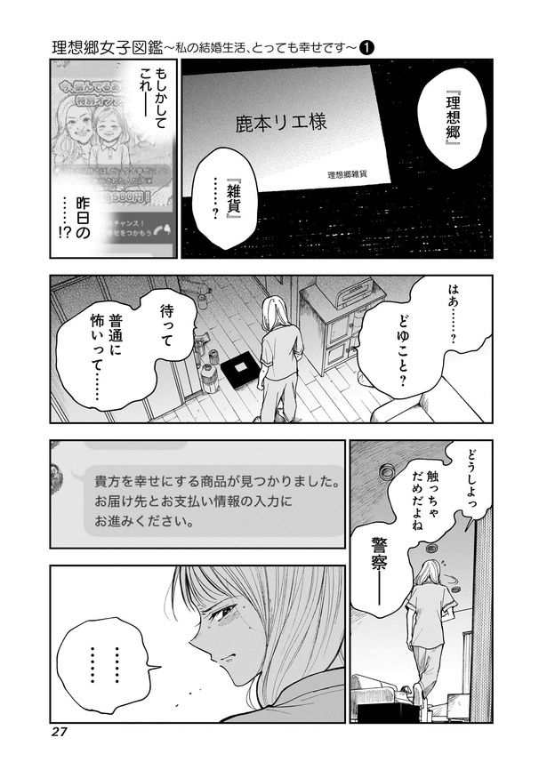 恋愛・結婚の悩みから「人生詰んだかも」と思ったとき、突如流れてくる謎のSNS広告。特別価格で販売される商品は、自分の悩みを解決する理想的なアイテムばかり。しかし各アイテムは、使用者の人生を左右する思わぬリスクもはらんでいて――。12月18日に第1巻発売の世にも不思議なマリッジ・ストーリー『理想郷女子図鑑~私の結婚生活、とっても幸せです~』の物語を、一部ご紹介します。