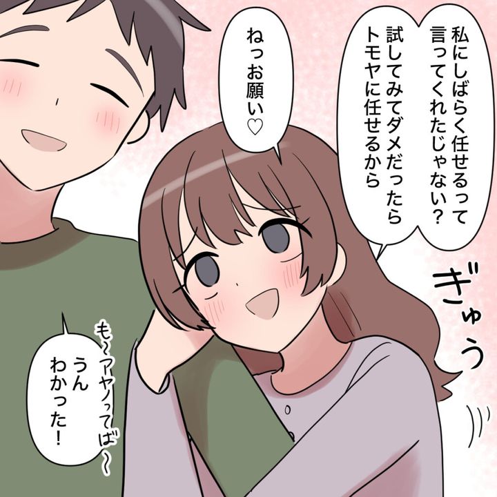 私はトモヤの腕にそっと手を回し、「しばらく任せるって言ってくれたじゃない?試してダメだったらトモヤに任せるから、ねっお願い」と甘えた声で上目遣い。その一撃が効いたのか、トモヤはふにゃりと表情を緩め、「うん、わかった!」と二つ返事で了承してくれました。