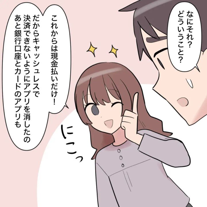 「これからは現金払いだけ!だからキャッシュレスで決済できないようにアプリを消したの、あと銀行口座とカードのアプリも」状況が飲み込めずぽかんと口を開けるトモヤに、私はニコッとウインクをしながら説明しました。