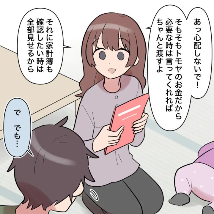 キャッシュカードもクレジットカードも没収されて不安そうなトモヤに、私はすかさず「あっ心配しないで!そもそもトモヤのお金だから必要な時は言ってくれればちゃんと渡すよ、家計簿も見せるし」と笑顔で言いました。しかし、トモヤはまだ納得がいかないようで「で、でも・・・」と渋ります。