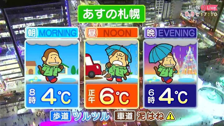 あすは雨が降りますね。昼頃から雨が降るため、傘を忘れないで下さい。朝から気温はプラスで、歩道はツルツル、車道は水たまりや泥はねと路面状況が変わりやすくなりそうです。