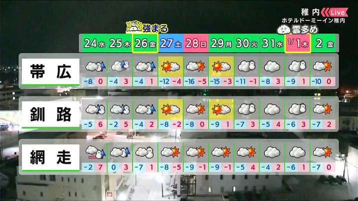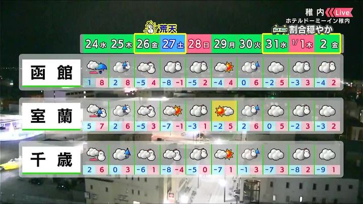 稚内は穏やかそうです。あす24日(水)は雨ですが、週末は雪と寒さに注意が必要です。