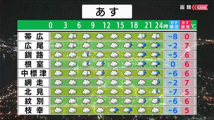道東は朝晩を中心に雨や雪、オホーツク海側も夜は雨や雪が降るでしょう。最低気温は北見で今朝より11度も高くなります。
