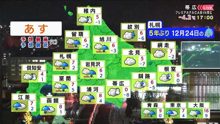 広く雨が降るでしょう。札幌で12月24日に雨が降るのは5年ぶりで、クリスマスイブのお出かけは傘が必要です。最高気温は帯広で0度の他は、5度くらいまで上がります。