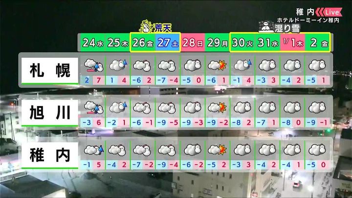 26日金曜から27日土曜は警報級の猛吹雪となるおそれがあります。年末年始は荒れる可能性は低いですが、湿った雪が降るでしょう。