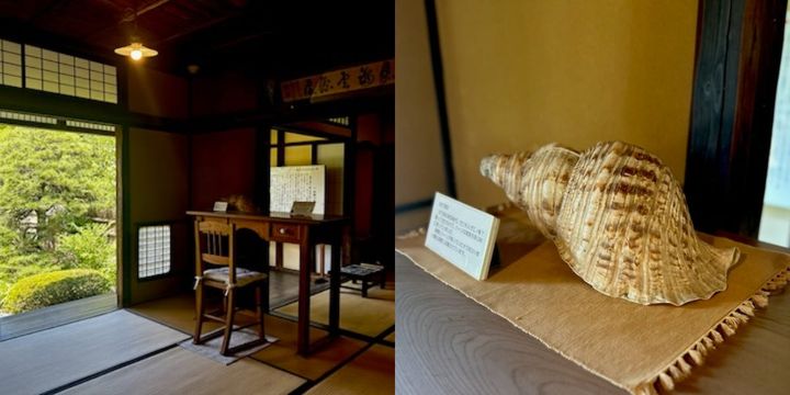 小泉八雲の使っていた机と椅子のレプリカ、そして机の上にはほら貝。ほら貝はセツが江ノ島で買ってきたもので八雲が家族を呼ぶときに吹いていたそうです。実際に使われてたほら貝は小泉八雲記念館に展示されています fujingaho