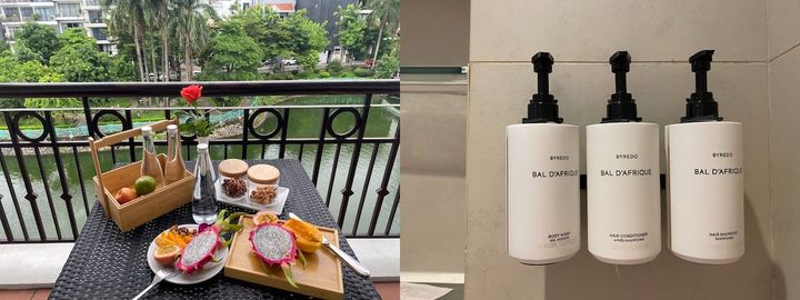 左:早朝の湖を眺めながら、テラス席からサービスのウェルカムフルーツをいただくリッチなひととき。 右:アメニティはなんと、ラグジュアリーフレグランスブランドの「BYREDO(バイレード)」。憧れブランドのアイテムを使えるのがうれしい!