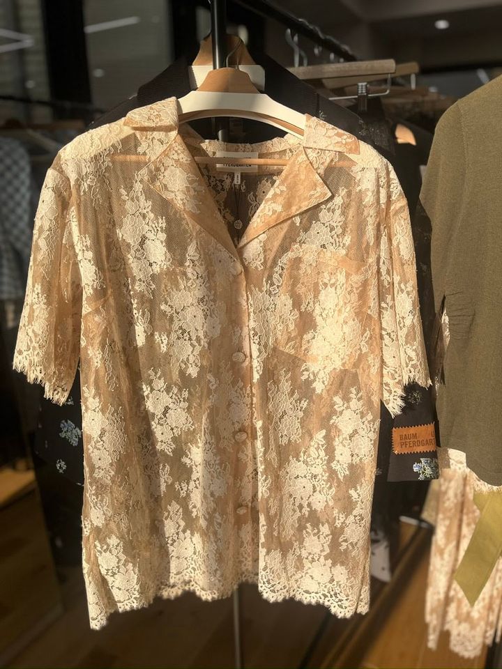 春になるとレースをまといたくなるのに、メンズライクな服が基本だからかちょっと抵抗があるんです。そんな筆者でも「これならイケる! 」と思ったのが、【バウム・ウンド・ヘルガーテン】のシャツです。何がイイのかというと、オーバーサイズのオープンカラーシャツってところ。レースのトップスってデザインも甘めが多い気がしますが、こちらはカジュアルでラフ。だからこそ取り入れやすそうですし、筆者のユニフォームともいえるデニムやスラックスとも相性がよさそう! 透け感があるのでレイヤードも楽しめることを考えると、このシャツは春夏のスタメントップスになる! と断言しちゃいます。