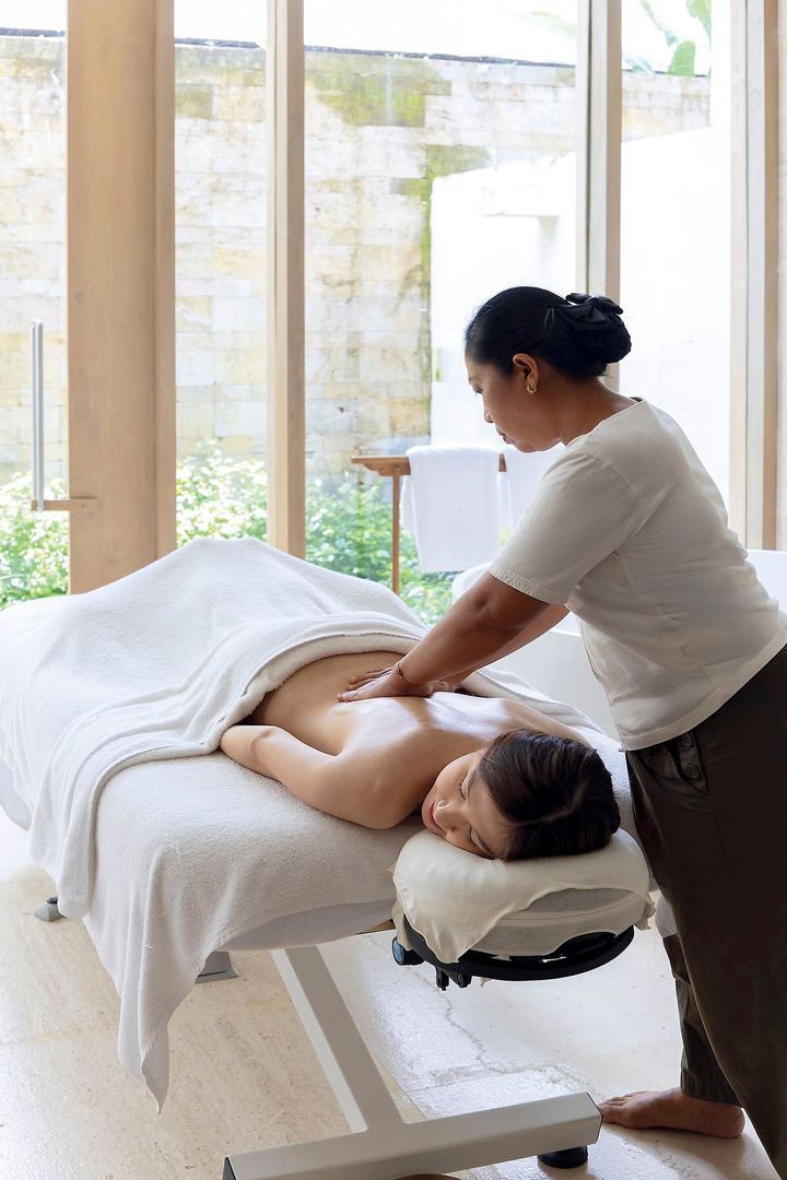 スパメニューの一番人気はシグネチャーの「コモ シャンバラ マッサージ」。トリートメントには「コモ シャンバラ」オリジナルのボディオイルが使用される。精油の香りに包まれて受けるロングストロークのマッサージは、身も心もほぐれる至福のひとときに。 撮影=名和真紀子