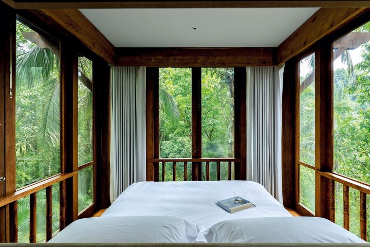2025年、全面改装されたレジデンス「ワナカサ」。寝室は三面が窓。緑の深いジャングルの景色とともに迎える朝は、非日常の気分に溢れるはず。内装は「オジャス」と同じく、池淵氏が手掛けた。 撮影=名和真紀子