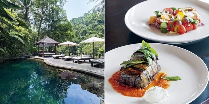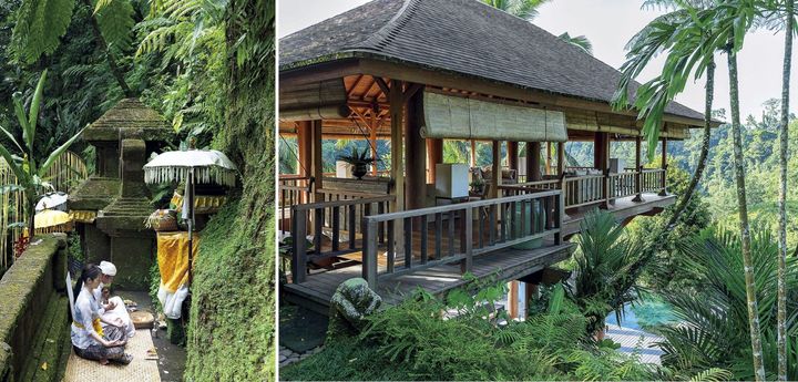 〈左〉「ケダラ ウォーター ガーデン」内の寺院で、バリ島のヒンドゥー教の“浄化の儀式”を体験できる(2,500,000 IDR、税・サ別)。癒やしの湧き水で身を清めたあと、司祭の横で祈りを捧げる。 この体験はガイド付きで、 定員は2名まで。<br>〈右〉“霧の森”を意味する「ワナカサ」。ツリーハウスのようなリビングパビリオンやインフィニティプールからは、ガジュマルの木々や、さらに約100メートル下を流れるアユン川を望むことができる。 撮影=名和真紀子