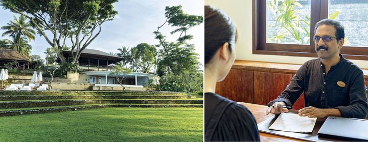 〈左〉トリートメントルームや各種ヘルステック設備、ヨガスタジオが集まるウェルネス施設「オジャス」。問診のあとに決まったスケジュールに合わせてこちらに通い、滞在中に施術やレッスンを受ける。<br>〈右〉常駐のドクターによるコンサルテーションでは、その日の体の状態や健康の悩み、生活習慣などについて丁寧にヒアリング。滞在中のトリートメントなどの予定も、この内容を踏まえて組んでもらう。 撮影=名和真紀子