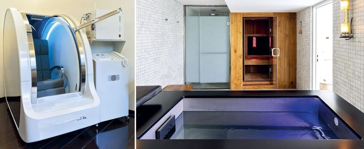 〈左〉2025年に新導入された高気圧酸素療法用の機器。圧力の高い空間で1時間過ごすことで、酸素と水素を同時に浴びることができる。睡眠の悩みがある人、ストレスや疲れが溜まっている人におすすめ。<br>〈右〉赤外線サウナ(奥)とアイスバス(手前)からなる、コントラストセラピー専用ルーム。体に温冷の刺激を交互に与えることで、疲労回復や血行促進をサポートする。こちらも2025年に導入された新設備。 撮影=名和真紀子